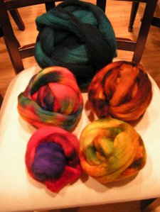 Dyed Wool Posted on February 5, 2007 by ruthlane under Uncategorized Here’s a pound of wool that I dyed with Jacquard acid dyes. The teal was dyed in a pot, the multi colored ones were done with plastic wrap, “painted” and then steamed. Share this: Click to share on X (Opens in new window) X Click to share on Facebook (Opens in new window) Facebook Click to share on Pinterest (Opens in new window) Pinterest Like Loading... Related