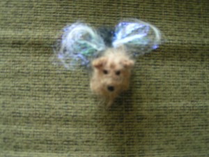 Buddy Angels Posted on March 11, 2007 by ruthlane under Uncategorized Here are my two needle felted yorkies with heat bondable angelina fiber wings. The wings look so gossamer, they turned out just as I had hoped – very thin, irridescent but still hold their shape. Share this: Click to share on X (Opens in new window) X Click to share on Facebook (Opens in new window) Facebook Click to share on Pinterest (Opens in new window) Pinterest Like Loading... Related