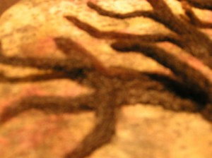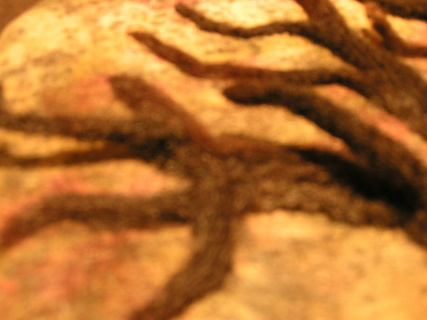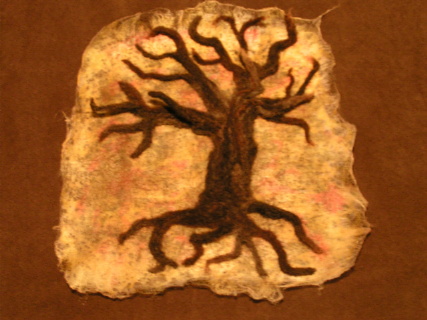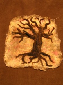Needle felted tree on silk fused paper Posted on March 29, 2007 by ruthlane under Uncategorized The silk paper was made from undyed silk, I then painted with Dye-na-flow paints, overdyed with tea and then “rusted” with steel wool and salt water. I then needlefelted the tree on to the silk paper. The wool used was New Zealand romney. Share this: Click to share on X (Opens in new window) X Click to share on Facebook (Opens in new window) Facebook Click to share on Pinterest (Opens in new window) Pinterest Like Loading... Related