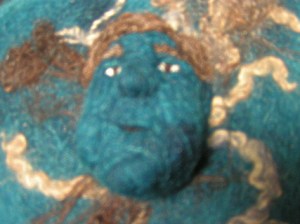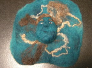 Needle felted relief face on wet felted square Posted on April 19, 2007 by ruthlane under Uncategorized This piece was done to practice a face in relief on a wet felted square. I am working on a large wet felted landscape that I want to cover with reliefs. So this teal man was my first try at a relief. Share this: Click to share on X (Opens in new window) X Click to share on Facebook (Opens in new window) Facebook Click to share on Pinterest (Opens in new window) Pinterest Like Loading... Related
