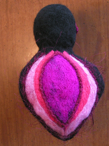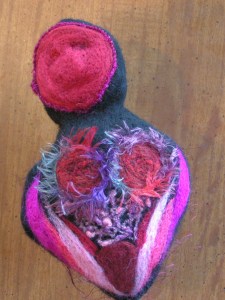 This piece was done on the needle felting machine. I started with black wool roving and made two doll shapes (front and back), I then added the embellishments and needled both doll shapes hard. I then put the finished outsides facing together and needled around the shapes edge to “sew” the doll together. I turned the piece right sides out, stuffed her with wool and needled the end. I did have to do some patching by needling by hand because I hadn’t gotten the black edges thick enough originally. So my first 3D piece made on the felting machine!