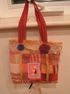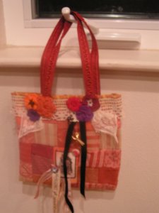 I participated in a fabric bag swap recently and this is the lovely bag that I received. This is the front side. It’s from Cynthia in Wyoming. The funniest thing is that when I sent an e-mail to Cynthia to thank her, she had visited Whitefish and been in my store! It’s a small world.