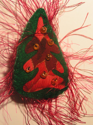 This is just a quick note because we’re having an office Christmas party here at the house in 45 minutes and I haven’t changed my clothes yet. But I wanted to show you these little tree pins that I made for little gifties. Some for the party goers this evening and some for our fiber group party on Thursday. I made 8 altogether. The first ones I couched the eyelash yarn on with blanket stitch. But it took forever and kept getting tangled up. It was a PIA. I glued the remaining ones. So was I doing something wrong or is it always painful to couch eyelash yarn??
