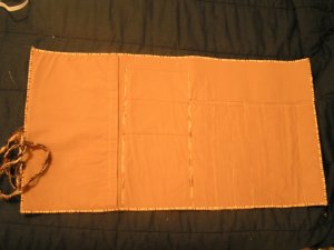Here’s the inside. There is a large pocket on the left with velcro closure. There are three pockets in the middle for circular needles and then long skinny pockets on the right for regular knitting needles. I worked my poor little fingers to the bone getting this done not to mention by aching back! But she’s a big knitter so I’m sure she’ll appreciate it.