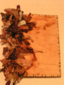 Here’s a journal I made today with the quilted rusted bits left over from my bil’s present where I cut out the center to put the bird pictures. I made a lining and used torn strips of cloth for the spine.