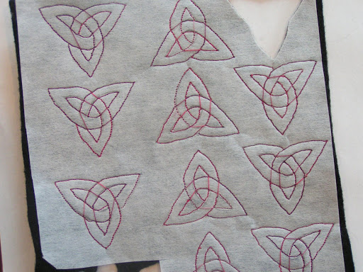 I then started on my celtic knots (only have about 30 to do – what was I thinking??). I put fusible Pellon on the black felt on which I’d traced the celtic knots. Then I used the variegated thread to stitch around the outline from the back side. This was so I could work from the front on the outline in black.