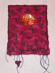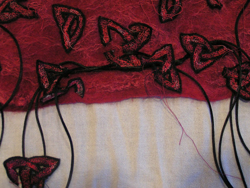 It’s finally finished! The front at least – I am planning on making a backing but didn’t have time to get that done. I’ll finish it up tomorrow. But it is still January here in Montana, although the February challenge is already been posted (more on that later). You can see most of my processes on previous posts. I hand stitched the celtic knots and machine stitched the central copper motif to the felted background. I did use heat, black acrylic paint and cranberry alcohol ink on the copper.