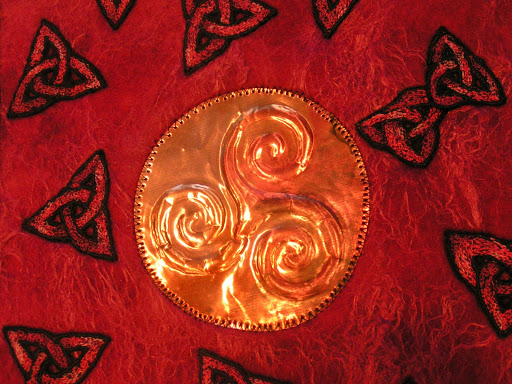 This is a closeup of the central copper piece. But you can’t see much of the distressing somehow. It disappeared in the shine of the metal. It shows better above. The triple spiral stands for female power through transition and growth and the celtic knots stand for the never ending cycle of life.