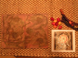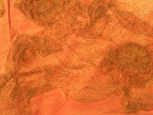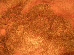 Look what Val sent me – a lovely piece of paper that she embellished with scrim and lace and painted, silk cocoons, silk rods and a beautiful card. Thanks Val! This was a swap where I sent her a UFO of mine that she liked (plus some silk and wool that I dyed). I think I got the better end of the deal!