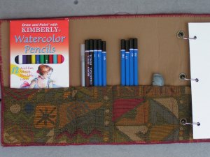 And the inside right cover with my watercolor supplies and a few extra drawing tools. I am currently working on improving my drawing skills. I got a book from the library called “Drawing for the Absolute and Utter Beginner” by Claire Watson Garcia. I highly recommend this book. I fit the category for this book perfectly but even after only a couple of weeks of working, I feel that I can draw much better. When I get brave, I’ll show you one of my sketches.