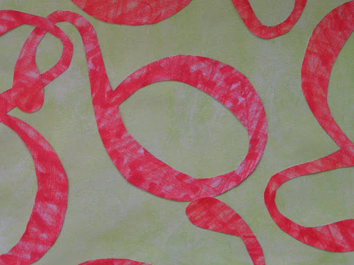 A closeup of my paper design. I was planning on taking this design, cutting it up and using different techniques to change each square. Then sewing the whole piece back together. The idea was to work in fabric, but I didn’t want to go and buy anything new. So I searched high and low and I have no fabric in these colors. So I looked further and found my paper towel “paint/dye rags” and I have several that fit the color scheme. So I’ve started with those and I plan to now make paper fabric out of those with muslin backing. Then I’ll continue along the same plan.