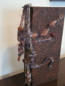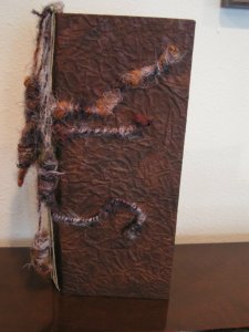 Here’s the final journal in Sue B’s course. I used more of the faux leather since I made such a large piece. I have enough for at least one more journal. I embellished with pipe cleaners wrapped with novelty yarn and similar beads.