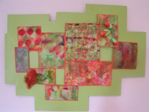 Here’s the final rendition of my April TIF which is called “Transformed”. I sewed the piece to the green mat. See earlier posts for how this was made. I worked today on two pieces of felt to make a couple of bags as well as playing with some oil pastels. So hopefully more updates this weekend. I have also been working on my artist’s statement for May TIF. I have a first draft and I’m trying to decide if I want to do a logo or just use photos of my work. More later…