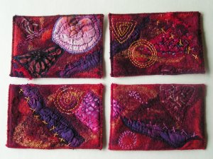 I made four postcards. One is going to the Cyber Fiber exhibition by Susan Lenz. Can you pick which one I’m sending? These are made with the same technique as the iris. I did add some hand stitching this time though.