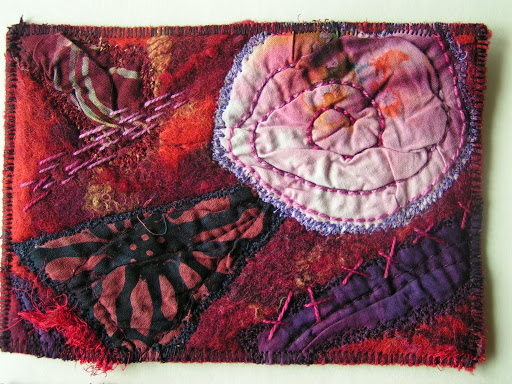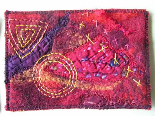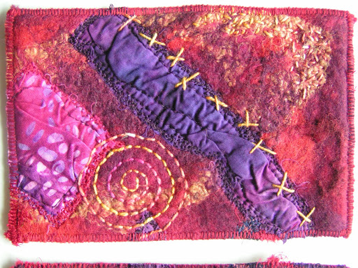 I made four postcards. One is going to the Cyber Fiber exhibition by Susan Lenz. Can you pick which one I’m sending? These are made with the same technique as the iris. I did add some hand stitching this time though.