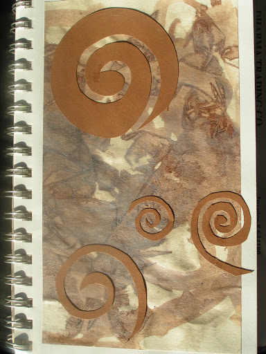 This last is a piece I put together when we were making patterns for our flower pin shapes. I cut out some spirals which weren’t going to work with fulled fabrics so I added them to a watercolor painting I had done several weeks ago. Off to have more fun!