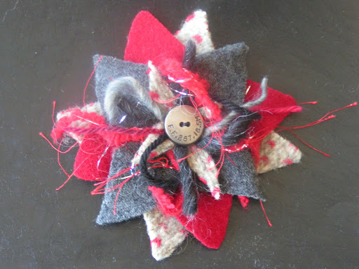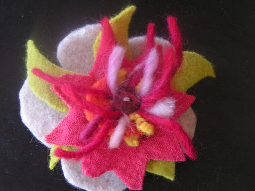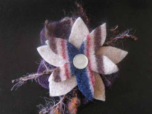 We have been playing with fiber all weekend here at my house. My sister is visiting with her family and we went to the Salvation Army and bought lots of wool sweaters and wool skirts, threw them in the washer and fulled them down to make flower pins. I now have five full gallon bags of these shapes that I can sew together and then sell these at the store. This is the one I made as a demo.