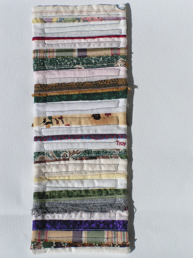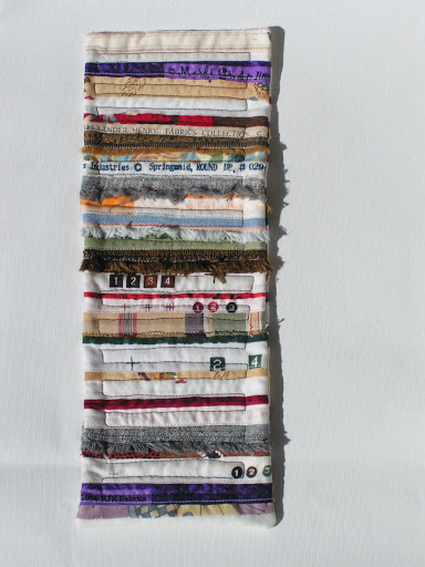 basic directions from there to make this piece. It was originally going to be a scroll but I don’t really like it rolled up so it is going to be a small quiltie. These were all selvages from my scrap bin and I made the quilt double sided. The quilting of the piece was to further emphasize lines on a list.