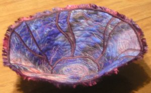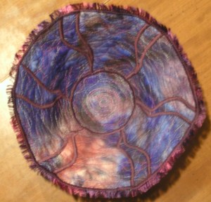 but it isn’t a vessel used in the last supper, it’s my last Christmas present finally completed. I did this one in a circle shape using two layers of painted cotton batting with a piece of canvas sandwiched in between. I had the cotton batting left over from a project I did last Christmas (still have some left for another project).