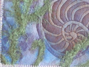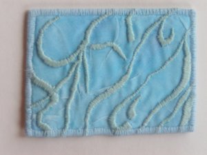 This is my blue postcard. It really doesn’t look very blue here but the camera seemed to turn it very purple. Read purple as navy blue. I stenciled the nautilus on painted fusible interfacing and then stitched. I added the sea weed with the needle felting machine. The nautilus looked kind of lonely by itself. I don’t usually use a lot of blue but that was the theme.