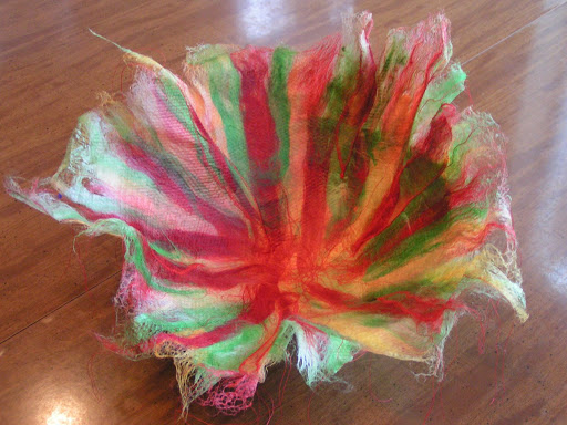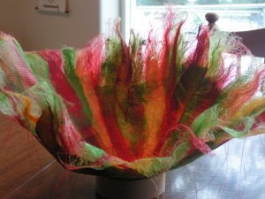 And as it is supposed to suggest a flower. It is sitting on a circle of cardboard. Otherwise it tips over too easily. I am planning on embellishing the cardboard to match. I left all the endings of threads to hang loose from the edge. You can just see them here. Where oh where is my light box? I’ve got to make one soon.