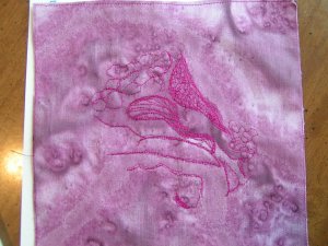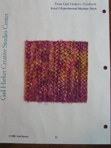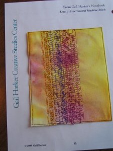 These are all my samples from the class I took. It was wonderful, we went over all the basics (most of which I needed) and I learned a lot about different threads, needles etc. which will be a big help since I just was guessing before. The first day we painted all of our fabrics with Dye-na-Flow paints and then we started stitching. The sample above is drizzling stitch.