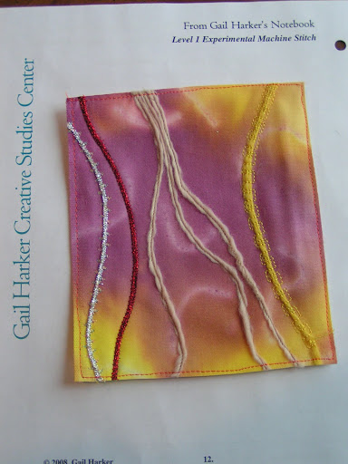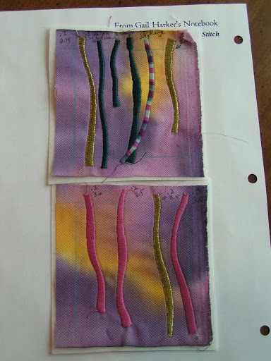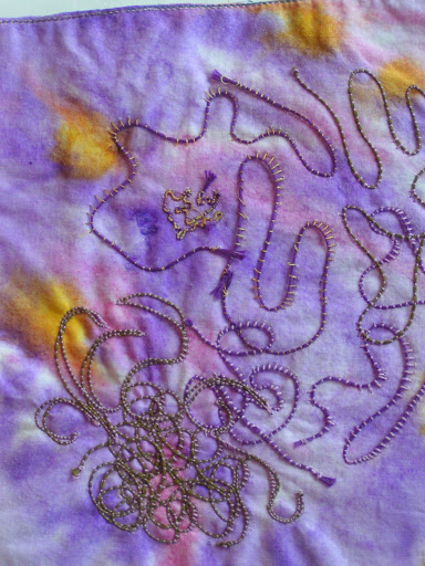 These are all my samples from the class I took. It was wonderful, we went over all the basics (most of which I needed) and I learned a lot about different threads, needles etc. which will be a big help since I just was guessing before. The first day we painted all of our fabrics with Dye-na-Flow paints and then we started stitching. The sample above is drizzling stitch.