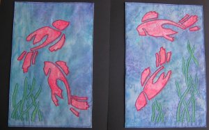 Here’s a photo of the inspiration. I chose the colors to represent salmon. I’m not sure that the concrete wall fish are supposed to be salmon but it reminded me of our trip and visit to the salmon festival.