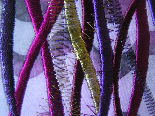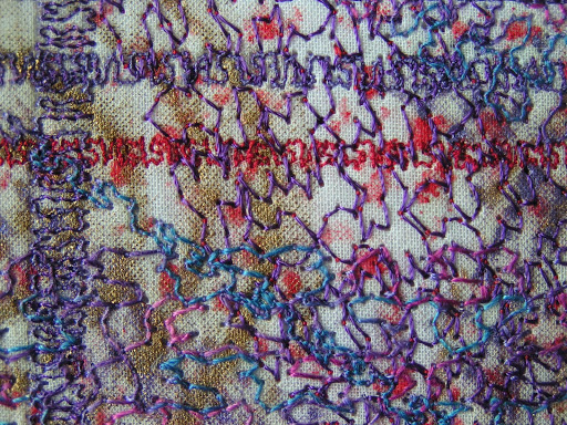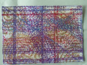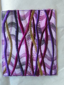 Here’s a small piece (5″x7″) that I did today. The base is muslin with oil paint stick rubbings. I then used an automatic stitch and varied the stitch width and length througout.