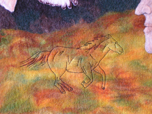 So I thread sketched a horse instead of the shield and I really like the change. I wanted a “dream” portion of the piece but could never figure out a good way to depict it. I think this is more what I was going for.