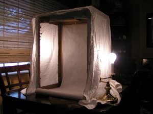 I finally made myself a photo light box. This is a very poor photo of it! I used a cardboard box, a sheet, two table lamps and some freezer paper for the back drop. All stuff I already had on hand and it really works pretty well. I would like to get some of the photo backdrop that professionals use but I haven’t ordered that yet.