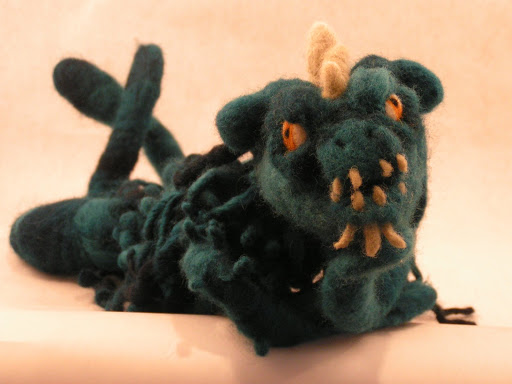 Here’s a photo taken in the box. It’s better than the photos that I took originally. This is Slime who I needle felted some time ago. He’s looking a little pensive today. I am still working on my application for the Landscapes Pfaff challenge – that’s one reason I wanted the light box so I could try for a better photo. I also made lots of felted cat toys and I have to put the finshing touches on those. So I am getting some work done in the fiber direction but not as much as usual as I have to work at the store on Fridays throughout May. Hopefully, I’ll be back to Fridays off in June.