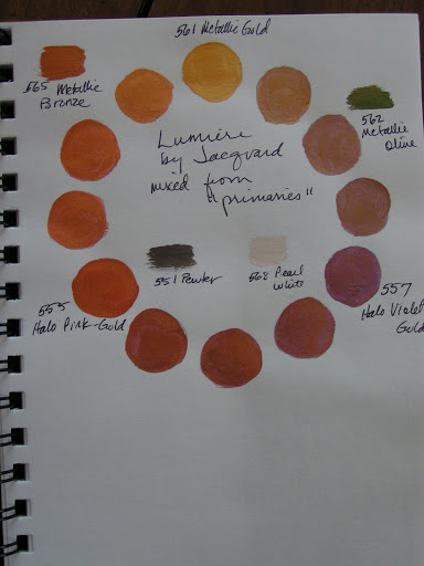 And finally I tried mixing Lumiere paints with the “primaries” of pink-gold, violet-gold and metallic gold. It didn’t give me a wide range of colors as there really wasn’t enough blue in the violet or red in the pink but it was an interesting experiment. Next week I get back to my regular schedule of having Fridays off so I hope to get more time to play with my fibers. I’ve got several projects that I want to get going so more later.