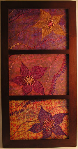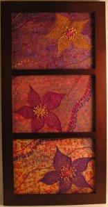 Framed! Posted on June 14, 2009 by ruthlane under Uncategorized I got the frames for my most recent machine embroidery pieces. Now to get them into the gallery and get them sold! Here’s the Blooms Trio – the lighting somehow wasn’t good for this photo but you get the idea. Share this: Click to share on X (Opens in new window) X Click to share on Facebook (Opens in new window) Facebook Click to share on Pinterest (Opens in new window) Pinterest Like Loading... Related