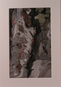 Anyways, now you can all see the piece entitled “The Landscape of Bark – Beneath Notice” that I entered. It is a 2D piece that is 18 x 27 cm. It is machine embroidery with on lay applique on a base of canvas. It is based on a photo of bark that I took in Glacier National Park. It represents a topographical map of bark as I always am reminded of topographical maps when I look at all my bark photos.