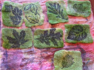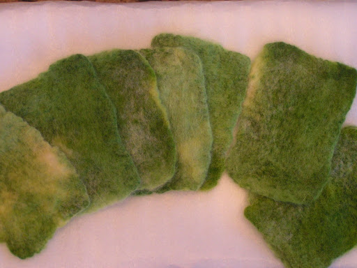 I had felted these coasters last week and now I dyed them green. I’ve been meaning to experiment with using thickened acid dyes for surface design and finally got around to doing that today.