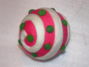 Here are a couple of Christmas ornaments that I’m giving as gifts this year. I’ve got 6 more to make. The ball is wet felted around a whiffle ball with a jingle bell inside. I then needle felted the decorations on the outside. I need to add a small loop for hanging but otherwise they are complete. I have completed another set of coasters but I can’t show those as they are for my sister and she occasionally reads the blog so they will have to wait until after Christmas until show and tell.