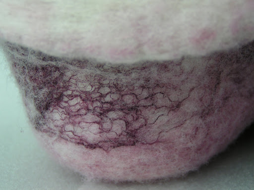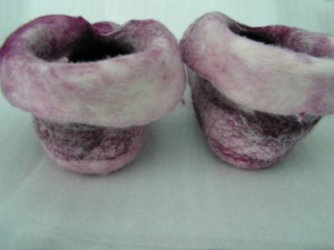 I made these yesterday afternoon. I started with white merino, added a bit of burgundy silk on the tops. Then I dyed the bottoms with more burgundy. The dye went further than expected so the tops are a bit darker than I had wanted but they will work fine.