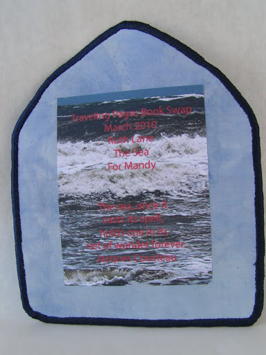 Here is the page that I made for Mandy for March for the Story of the Traveling Pages swap. Her theme is “The Sea” and I chose the jellyfish because I’ve always liked those photos of jellyfish that are so luminescent floating around in the sea. I did find with my research of the jellyfish that their populations are growing larger and larger mainly due to pollution and global warming. Jellyfish are able to survive with relatively little oxygen and therefore take over “dead zones” in the ocean. They eat the remaining native fish population and continue to thrive and reproduce. They are a sign that the oceans are out of balance. Of course, I never knew any of this before I started this page. Interesting, the things that you learn as you’re researching a project. I got most of my material from the Baltimore Aquarium website. The page is made from a painted background and  the jellyfish is made from a mixture of silk, Angelina fibers and paint. I then machine thread sketched over the jellyfish to give it more definition.