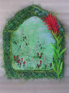 The back ground was hand painted. The edging is layers of fabric and thread collage covered with a green sheer, lattice hand stitched and then burnt back with a heat gun.