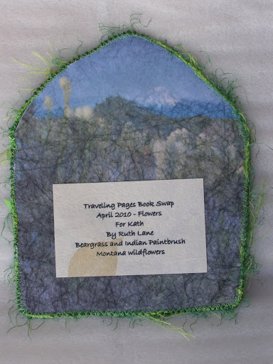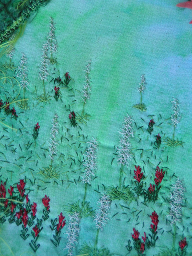 Kath got her flowers page for April so I can show it to you now. It’s based on beargrass and indian paintbrush wildflowers. Mainly all hand stitching because I couldn’t use the machine much last month. The big flower is made from Lutradur that I painted. A friend, Jan, gave me a big piece so that I could play with it. Thanks, Jan!
