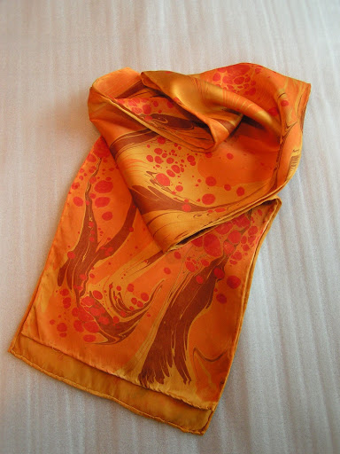 Here is one of the marbled scarves I made with our group at the first of the month. I over dyed it and again, in my favorite fall colors.