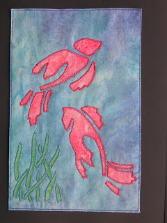 This is another assignment piece in machine embroidery.  Besides the out line of the fish and the grass, I don’t see a lot of use of line. Although the blue background has some light lines, I think the piece might have been enhanced a bit more if I had emphasized those lines in blue with more stitching. What do you think?