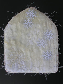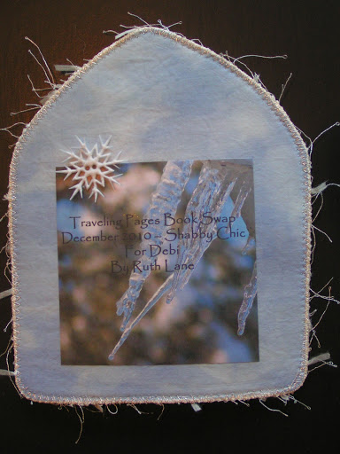 Here is the shabby chic/vintage page I made for Debi. She likes pale colors or white. So I went for the white on white and the theme of snowflakes. I nuno felted the background with several different kinds of wool, silk noil, lace and several ribbons. I added machine and hand stitching.
