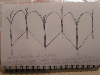 Last week we talked about form as it relates to a two dimensional work and how to imply form on your picture plane. Usually, I work in 2D more than 3D but I would like to do more 3D work. The sketch above shows what I plan to do with my Traveling Pages to make all 13 pages into a book form. As my theme is trees, the covers will resemble bark and the “posts” on the book will be red twig dogwood branches.