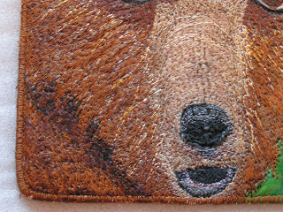 Then I thread sketched the bear. I used about ten different shades of brown for this. Even with two stitch and tear sheets behind the page, it still distorted quite a bit. But except for a few wrinkles here and there, I got it flattened back out again. The shape of the page makes her look a little like a cone head, don’t you think?