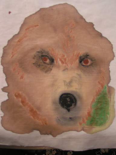 This is the beginnings of the page I made for Gayle. Her theme is All Creatures Great and Small. I wanted to do an animal that is native to Montana so I chose the grizzly bear. I had a photo from a calendar that I used as inspiration. I thought just the face coming out of the page would give a bigger impact and give a sense of the size of grizzlies. I painted this with a combination of walnut ink and Jacquard paint.