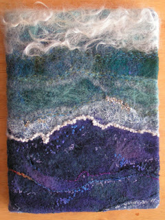 Here’s the inside of the cover without the book in place. That’s the only time you can see the purple which this photo made a bit more blue than it is in real life. I am also working on finishing up more barrettes, scarves and perhaps a felted vase. If I do get accepted, I’ll have to be very busy when I get back from my class and get pieces done to sell.