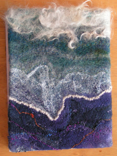Here’s the inside of the cover without the book in place. That’s the only time you can see the purple which this photo made a bit more blue than it is in real life. I am also working on finishing up more barrettes, scarves and perhaps a felted vase. If I do get accepted, I’ll have to be very busy when I get back from my class and get pieces done to sell.