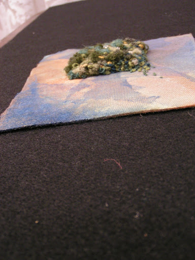 The background piece is hand painted felt with sheers, netting and tulle fused on top. I used a variety of yarns, threads and floss to make my knots from tiny ones up to humongous ones. And I love the texture. What do you think? Did I go overboard?